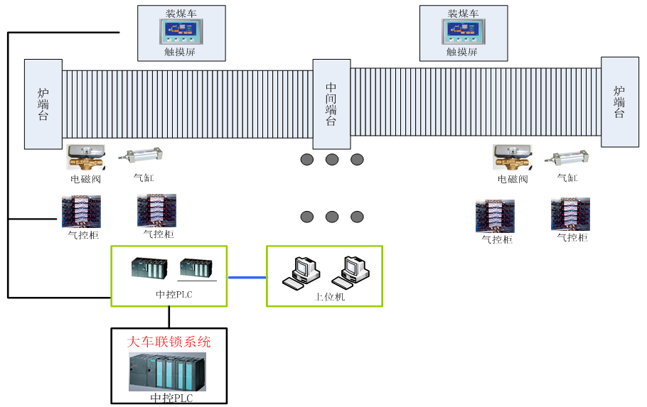 對上升管、內(nèi)翻板和高低壓氨水的相關(guān)動作和時間進行記錄,并對某一動作時間和動作間間隔等進行統(tǒng)計。可根據(jù)操作方式、操作內(nèi)容和時間等進行查詢。整個包括現(xiàn)場機械部分、現(xiàn)場 氣控柜部分、中控室部分、車載部 分和系統(tǒng)網(wǎng)絡(luò)。其中,現(xiàn)場部分是 系統(tǒng)的基礎(chǔ)硬件部分,其他三部分 為控制部分。現(xiàn)場部分包含上升管蓋、內(nèi)翻板和高低壓氨水實現(xiàn)自動控制所包含的氣缸、電磁閥及相關(guān)連接件。其他電氣和控制部分主要包含氣動閥組、PLC模塊和上位機等,分別用于對現(xiàn)場設(shè)備狀態(tài)采集和控制指令輸出、系統(tǒng)的控制邏輯判斷和指令下發(fā)和數(shù)據(jù)存儲、展示以及人機交互操作。